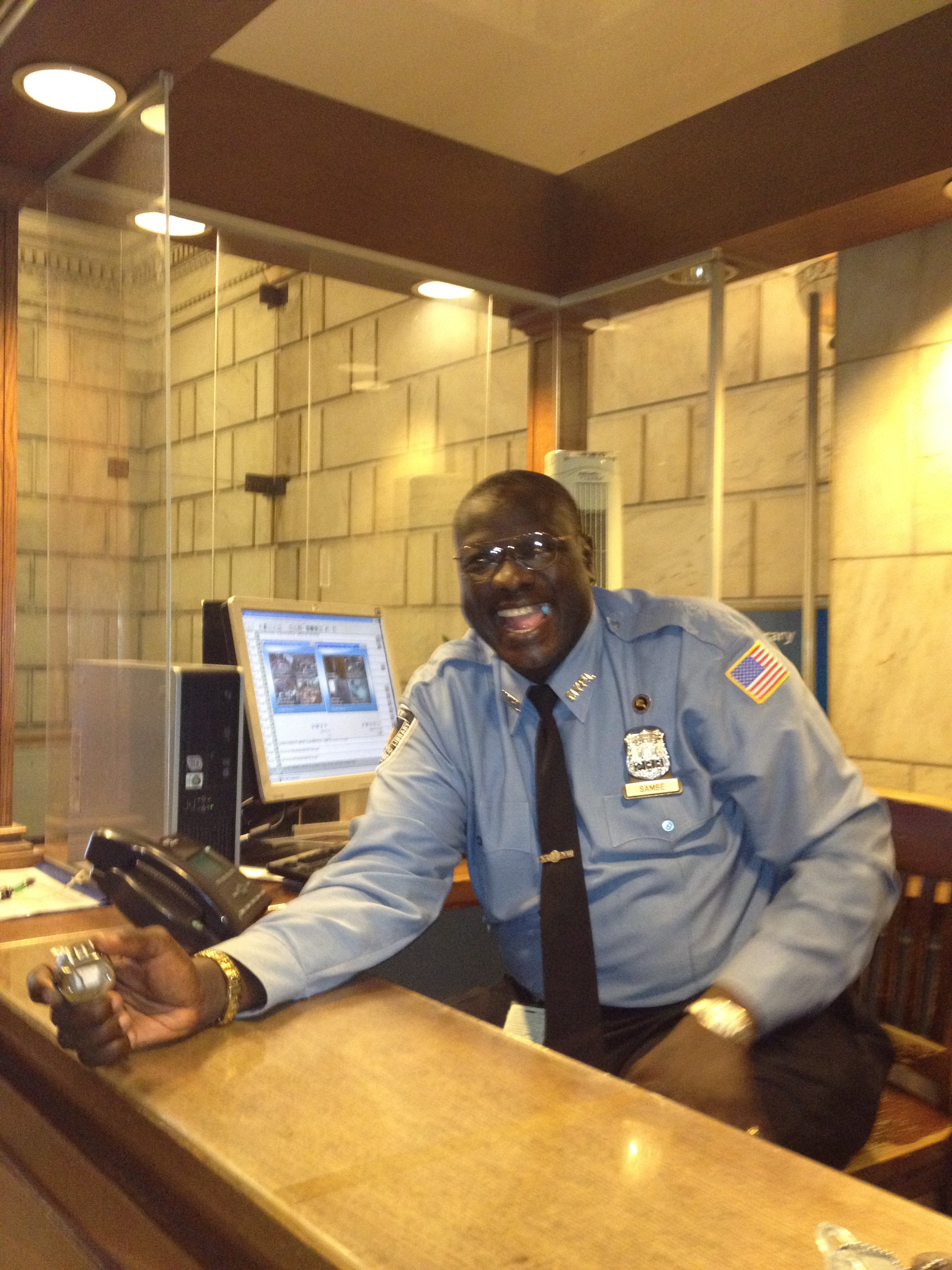 On my way out of the library, I met this guard at the 42nd Street entrance, who had told me to step lively on my way in, and “God bless you,” on my way out: