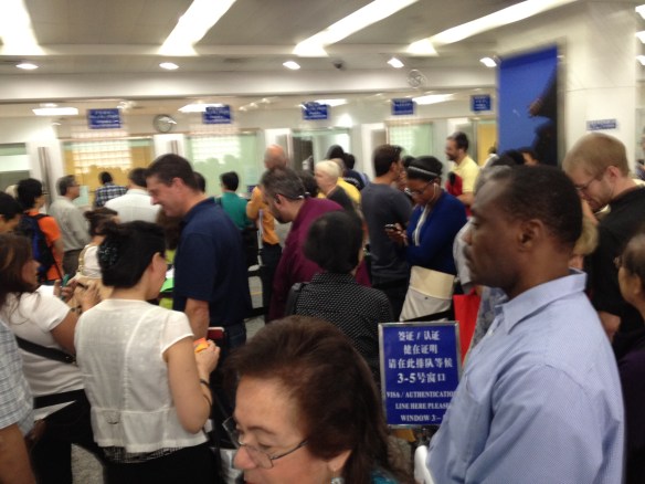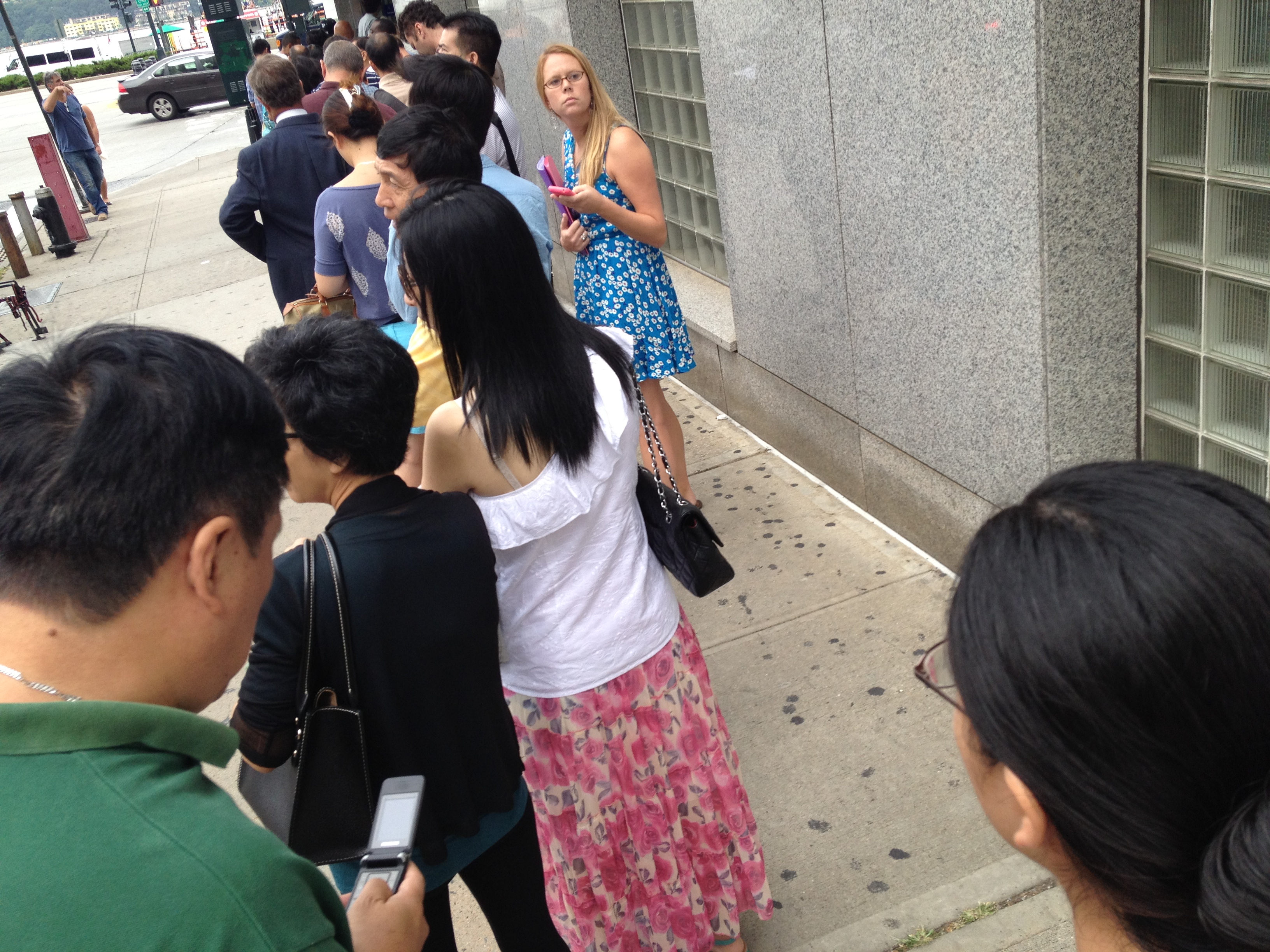 The place that Alvin is going to needs a special permit called a visa. So today I got up earlier than usual and hopped on a bus into New York City. When I got to the consulate where I was to get my visa, I was only the FIFTH person in line on the sidewalk. Wow! Count ’em, just five! I was super-duper excited! I’m never early, so being early made me feel AWAKE and AHEAD OF THE GAME! Then I started feeling outright SUPERIOR because just then the line formed rapidly in back of me and stretched down the block like at a rock concert!