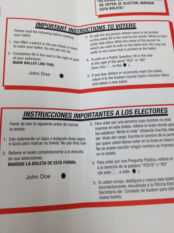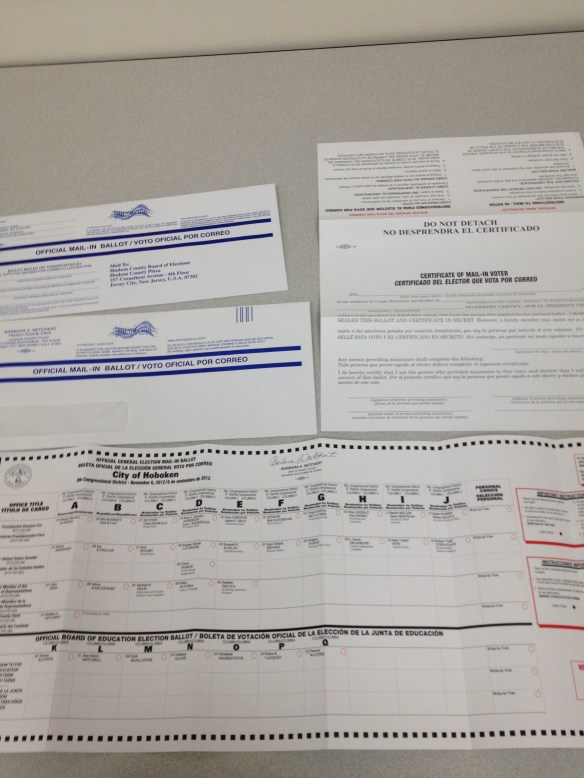If you do it in person, you can vote on the spot! You don’t have to wait for anything. You don’t have to mail something in. Here’s my ballot:Did you know that there are 10, yes, count ’em, TEN presidential candidates this year? I had no idea! In addition to the two parties that I knew about, on my ballot were the Green Party, NJ Justice Party, Libertarian Party, NSA Did 911, Constitution Party, Socialism and Liberation, American Third Position, and Socialist Workers Party. And if none of those will do, in the last column is a space for my “Write-in Vote.”