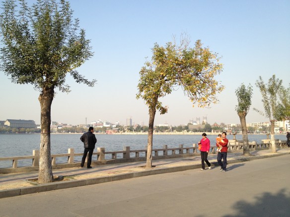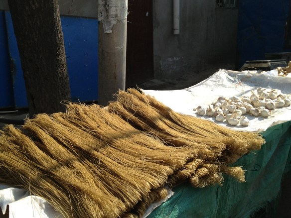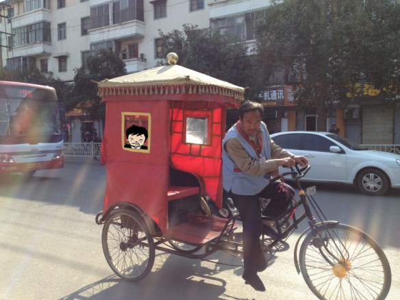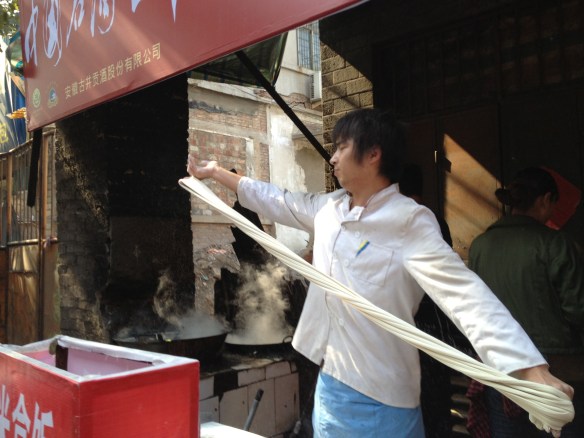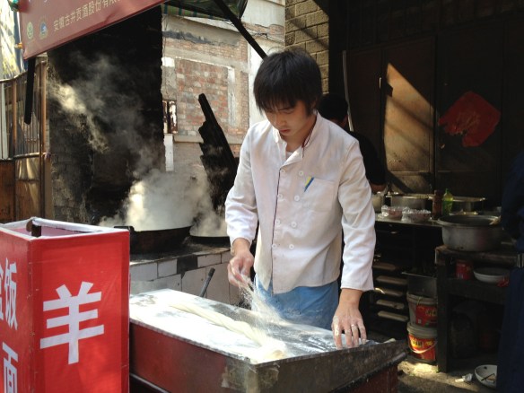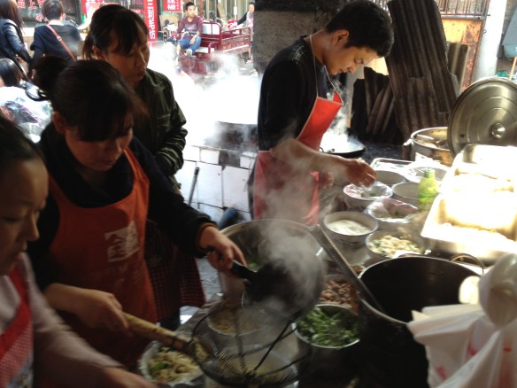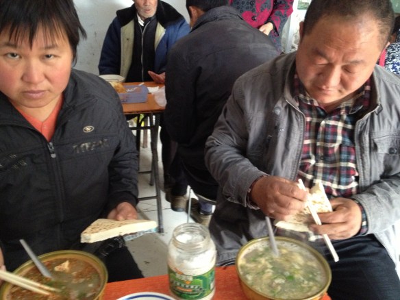 Their morning rice was a delicious smelling noodle soup with dumplings and mantou (bread) broken into it. I had no idea what it was, so I asked, “Jr shr shemma” — what is it? And they both said, “Meintou” like I was from Mars. She added that she liked hers with “lajiu” chile pepper, but he liked his without. Mmmmm. My zhou was very plain. I wanted to tell the cooks that I wanted to start my morning rice over and order something yummier. But I didn’t. I was afraid that I wouldn’t say it right and end up offending them by not eating my zhou and asking for something else. Then they’ll yell at me — one thing I’ve discovered, the Chinese are not shy about yelling at you when offended. So I ate my bowl of zhou quietly, the whole thing, it was so plain.