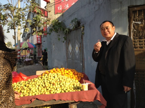 I told him that I was from “meiguo” — America — and that my parents are from Guangdong, hence the strange accent on my Putonghua (Mandarin). He said my Mandarin was “bucuo” (sounds like “buh tzoh”) — not bad — he could understand everything I said. I felt like dancing! It was enough to make me show off and ask his wife the price of their Mandarin oranges. She said it was wu yuan (5 yuan) for a “ke” — kilogram? I had no idea how much a kilogram was, but I understood the five yuan, so I nodded my head and said “hao” — good — to hide my ignorance, and prayed that I wasn’t going to be hauling a potato sack of oranges on my back. Five yuan is about 75 cents, and it bought quite a lot of Mandarin oranges, but not enough that I had to carry them on my back. She even tossed in a few green figs and said I should try them because they’re very good. I bowed many times and thanked her and then asked them where I could get a bowl of zhou, I hadn’t yet eaten my “zhao fan” — morning rice (I was really showing off now!) A man with a dirty apron happened to stop by at that moment and the fruit vendor and his wife told me to follow him, he was a zhou seller. Perfect! So I thank them and followed the zhou seller, but not before photographing the fruit vendor and his wife who were very happy to pose: